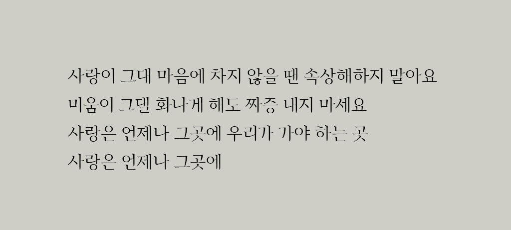 긴 문장에 적합한 본문용 글꼴로 2014년 완성된 아리따 부리는 현대적인 여성의 단아하고 지적인 멋스러움을 담고 있습니다. 국내 최초로 머리카락같이 가는 헤어라인 서체를 개발해 기업 글꼴의 새로운 흐름을 제시한 점을 높게 평가받고 있습니다.