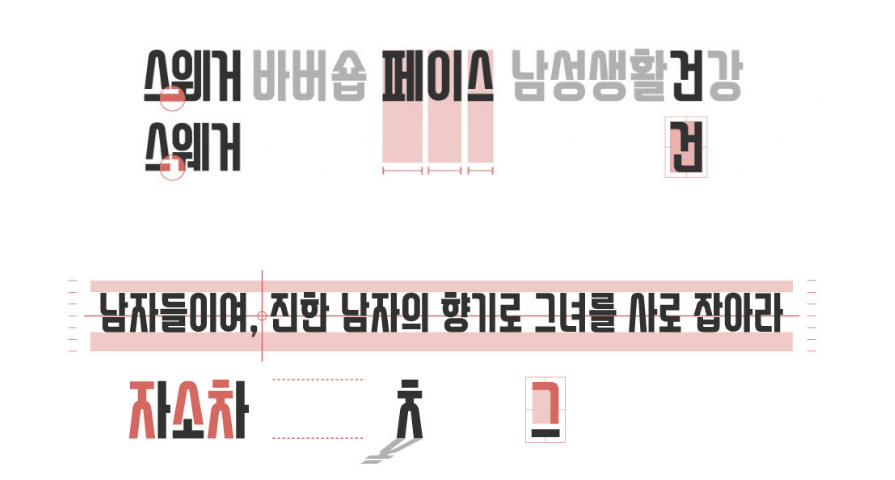 또한, 스웨거가 추구하는 남자의 이미지가 폰트에 그대로 반영되어 ㅅ. ㅈ. ㅊ 계열들이 사람이 서 있는 것처럼 당당한 모습으로 형상화, 초성을 조금 크게하여 전체적으로 흔들림 없이 꽉 짜인 든든한 구조도 스웨거체의 두드러지는 특징입니다.
